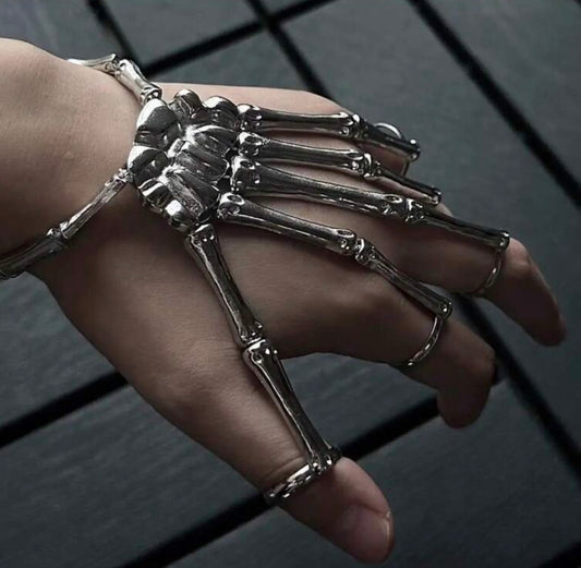 Punk Style Metal Hand Bone Shape Bracelet + Ring Integrated Design Dark Gothic Imitation Hand Bone Structure Covers Back Of Hand And Fingers Unique Cool Style -Silver
