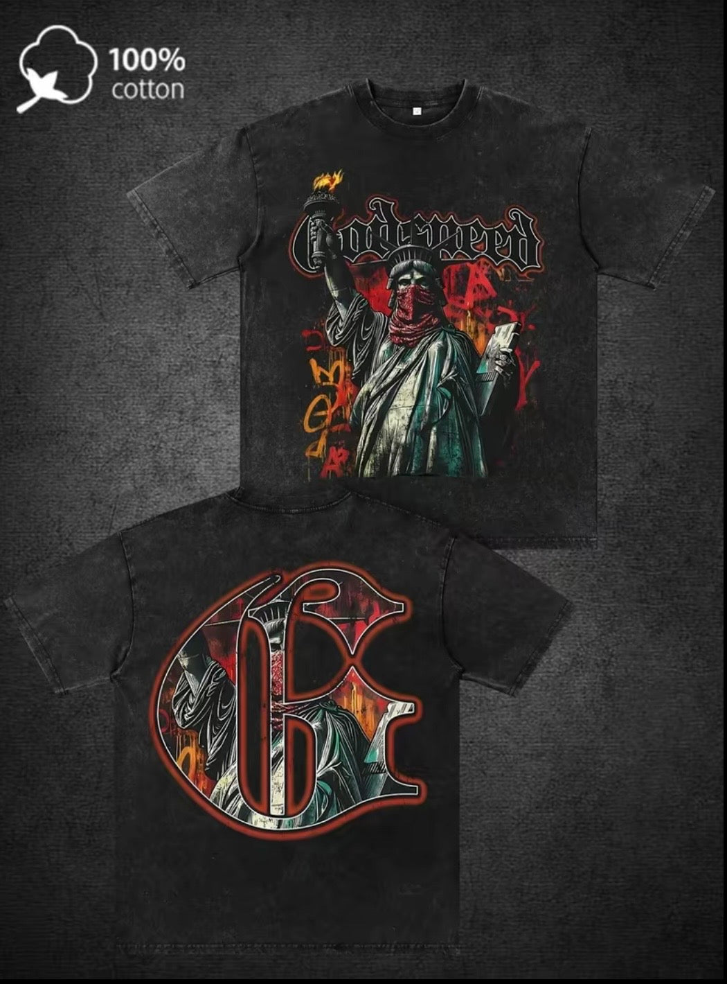 GODSPEED Men's Gothic Graphic Print T-Shirt - 100% Cotton Distressed Washed Streetwear Tee with Drop Shoulder, Loose Fit Y2K Harajuku Style, Machine Washable Casual Summer Top, Heat Transfer Apparel, Bold Logo Design, Durable Stre